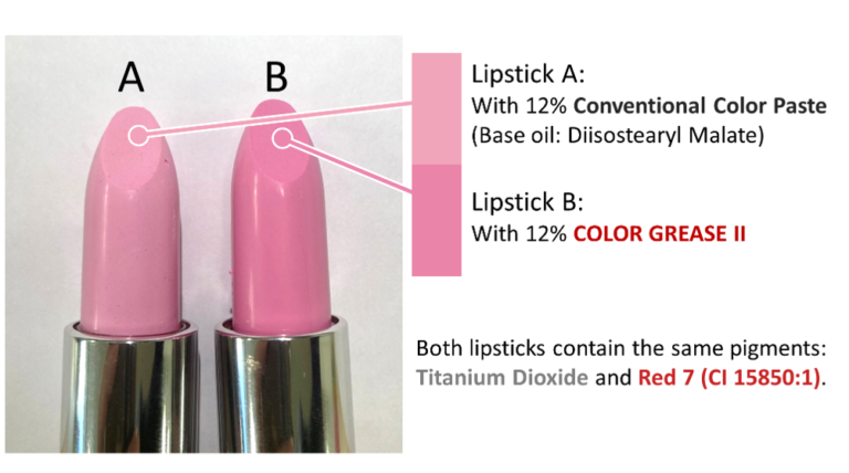 Lipstick Aは、従来のカラーペースト(基剤: リンゴ酸ジイソステアリル)を用いて着色されています。白っぽい色調で、顔料であるTiO2と赤202の分散が不十分で、赤202がTiO2に隠れていると考えられます。一方、COLOR GREASE IIを配合したLipstick Bは、より鮮やかなピンク色をしています。これは、キャンデリラ樹脂と顔料の複合体が均一に分散していることが示唆されます。