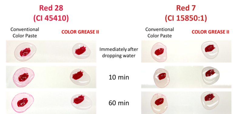 COLOR GREASE IIと従来のカラーペースト(基剤: リンゴ酸ジイソステアリル)に水を滴下したところ、従来のカラーペーストでは顔料の滲み(ブリーディング)が見られましたが、COLOR GREASE IIでは滲みが見られませんでした。