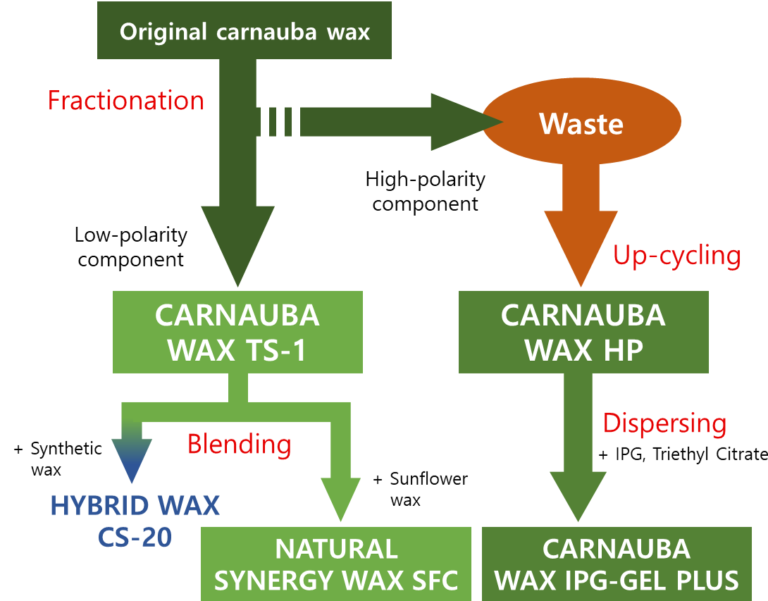 Noupotentia Japanでは、カルナウバワックスを低極性カルナウバワックス(TS-1)と高極性カルナウバワックス(HP)に分画しており、さらにそれらを活用した派生品も開発・製造しています。