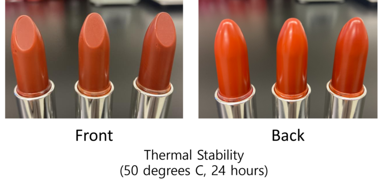 温度安定性もまたワックスの重要な評価指標です。特に、合成のワックスを使わず天然のワックスとオイルだけでリップスティックを作ろうとすると、熱安定性に乏しく高温で発汗を引き起こす傾向があります。